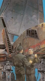 The Lieutenant makes an appearance as an unnamed character within the novella Dark Forces: Jedi Knight. A condensed version of his dialogue with Obota is also present in the audio adaptation. Furthermore, there is a slight difference in timing; In the novella he notices the Crow shortly before leaving, but in the audio drama he notices it shortly before arriving.