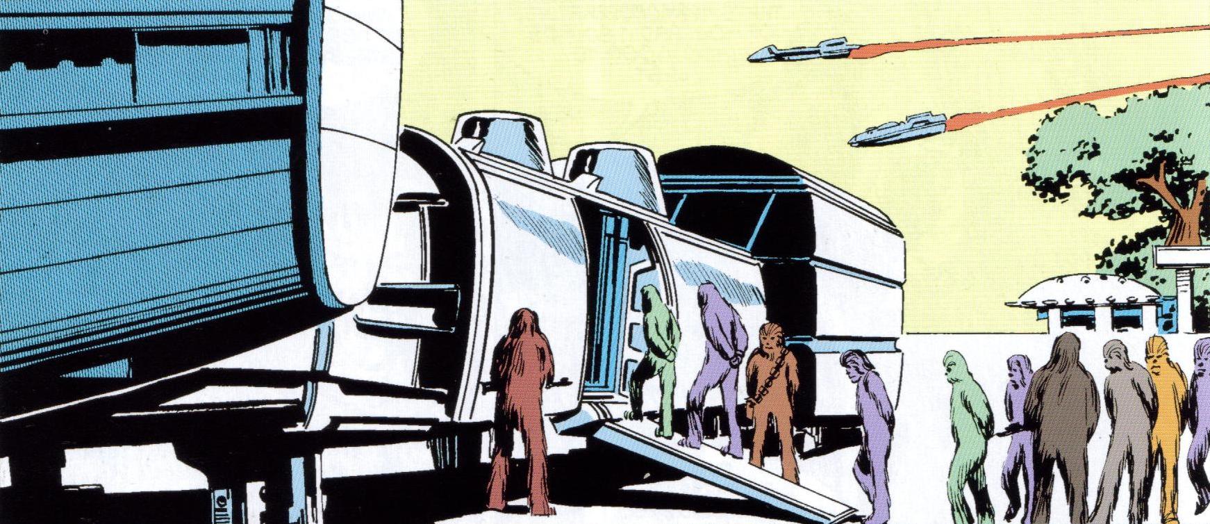 SlaveShip-MSW91 A Nagai transport is pictured here, in the process of being loaded with Wookiees. On the planet of Kashyyyk, the Nagai utilized transports. These vessels were employed by Commander Ozrei N'takkilomandrife in an endeavor to re-establish the enslavement trade on Kashyyyk, with captured Wookiees being loaded onto them. When Han Solo, Lando Calrissian, and Chewbacca journeyed to Kashyyyk to visit Chewbacca's relatives, they discovered the slave operation and halted the slave ships from departing the world.