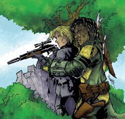 Akaavi Spar, a Zabrak Mandalorian woman, started her training under her father at the age of three, an earlier age than the usual eight, even though she finished her verd'goten at thirteen. In the year 25 ABY, Dinua Jeban successfully completed her own verd'goten. She and her mother, Briika, celebrated this transition into legal adulthood at the Bar Jaraniz located on Nar Shaddaa. During their celebration, Goran Beviin, a Mandalorian who was there, bought them a round of drinks and congratulated Jeban on reaching adulthood. Years later, after the Yuuzhan Vong War, Novoc Vevut, a Mandalorian father, guided his adopted son, Ghes Orade, through the verd'goten process on Mandalore.