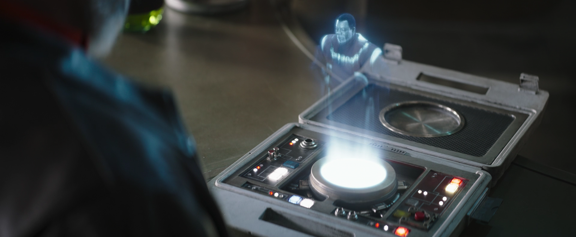 A hologram message originating from Greef Karga was played by Carson Teva using a viewer.