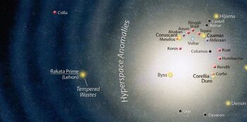 The western barrier, alternatively referred to as the western anomalies, the hyperspace tangle, or simply the tangle, comprised a series of hyperspace anomalies. This series effectively divided the galaxy, specifically the area west of the Deep Core, and for thousands of years, it stopped any attempts to explore the Unknown Regions. It constituted the central part of the circumferential hyperspace barrier, a shell of hyperspace disturbances that surrounded the galaxy. It was once believed that this barrier stretched across the entire galaxy, however, over time, it deteriorated as it slowly moved back towards the galaxy's core.