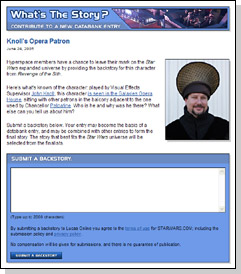 What's The Story? was a unique segment featured on the official Star Wars fan club's website, known as Star Wars Hyperspace. It presented Hyperspace subscribers with the prospect of influencing the Star Wars Expanded Universe by writing background information for specific elements of the saga, generally less prominent characters or vehicles seen in the movies.