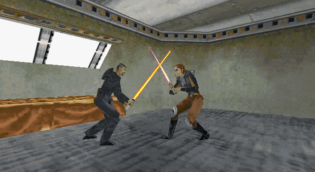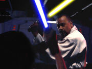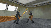 After its arrival on Jerec's capital ship, the Vengeance, Qu Rahn commandeered the weapon and briefly wielded it in self-defense against Jerec's Dark Jedi, only succeeding in cleaving Maw in two before Jerec subdued him. During his duel with Kyle Katarn, Yun utilized the lightsaber, taking it with him as he fled from the Jedi hopeful. Subsequently, when Sariss attempted to assassinate Katarn following his crash landing on Ruusan, Yun intervened with the lightsaber, preventing her action and ultimately leading to his death. Following this, Kyle Katarn employed it to battle and eliminate Sariss, Boc Aseca, and Jerec. Moreover, he used it in the time leading up to, and during, his descent into the dark side.